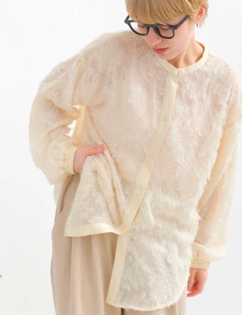 フェザーのような繊細なジャガード織りが美しい上品なロングブラウス。