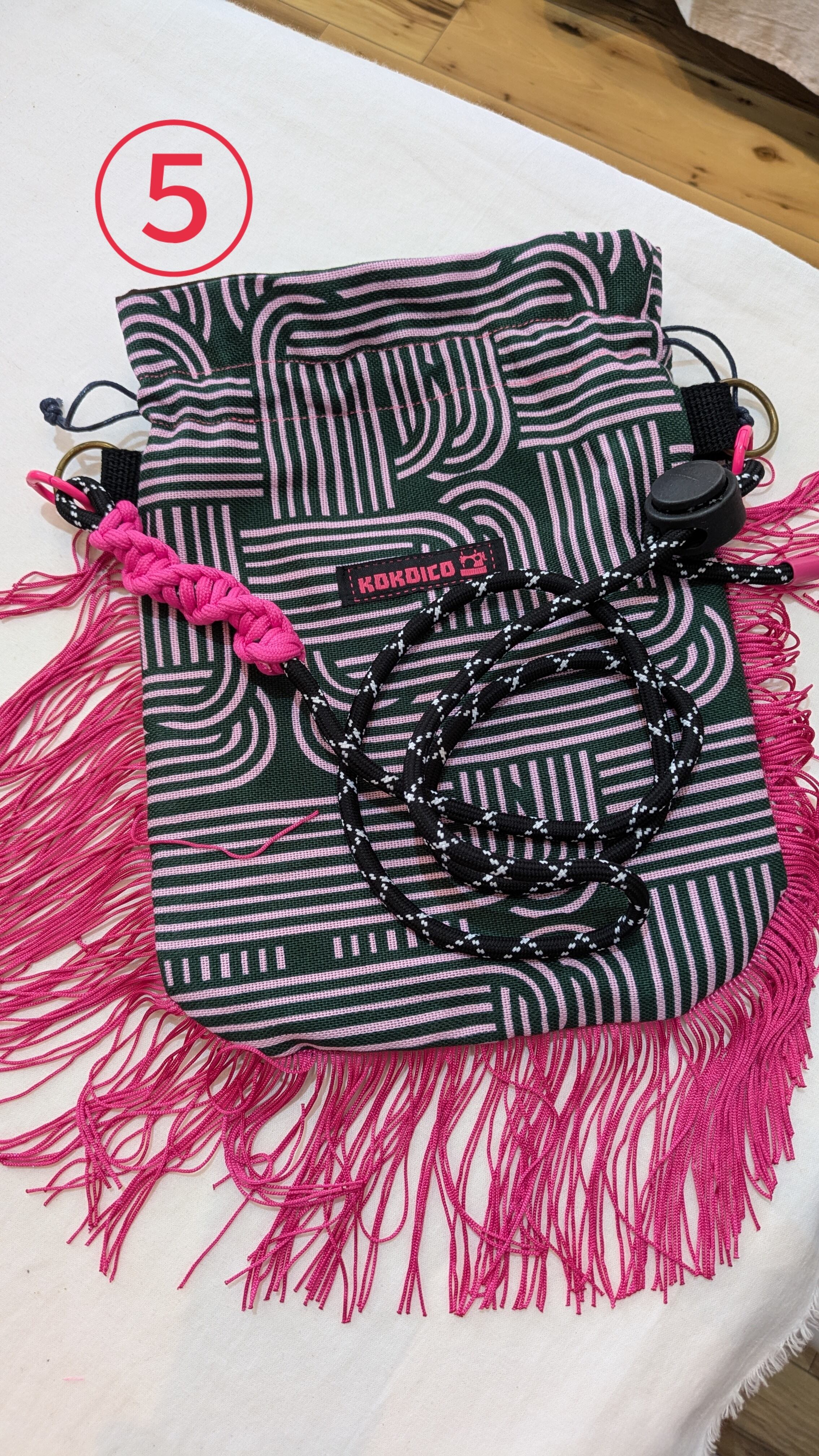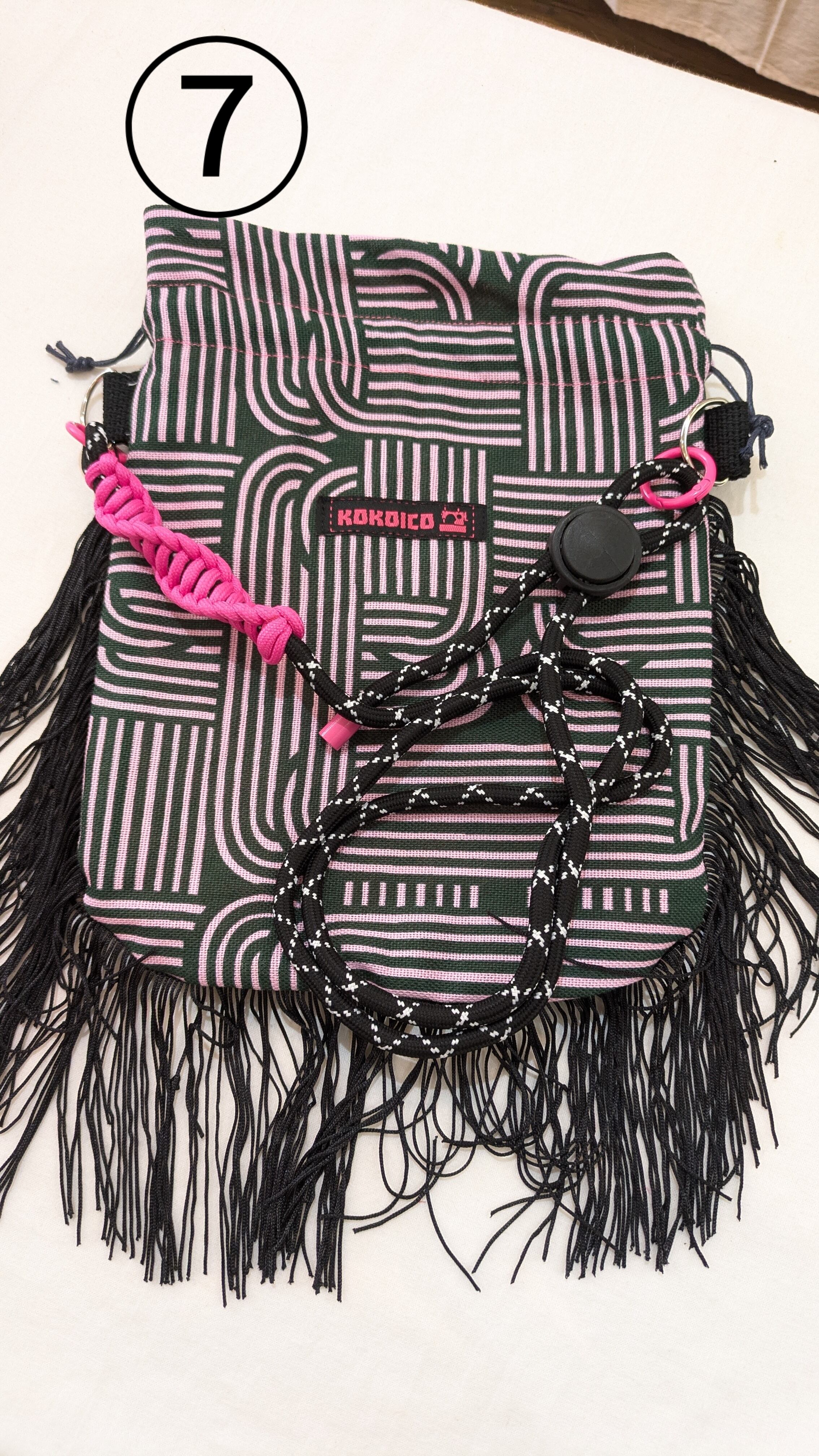 ネオンカラーフリンジと幾何学模様が個性的な魅力を引き立てる、手作りのフリンジショルダー巾着です!