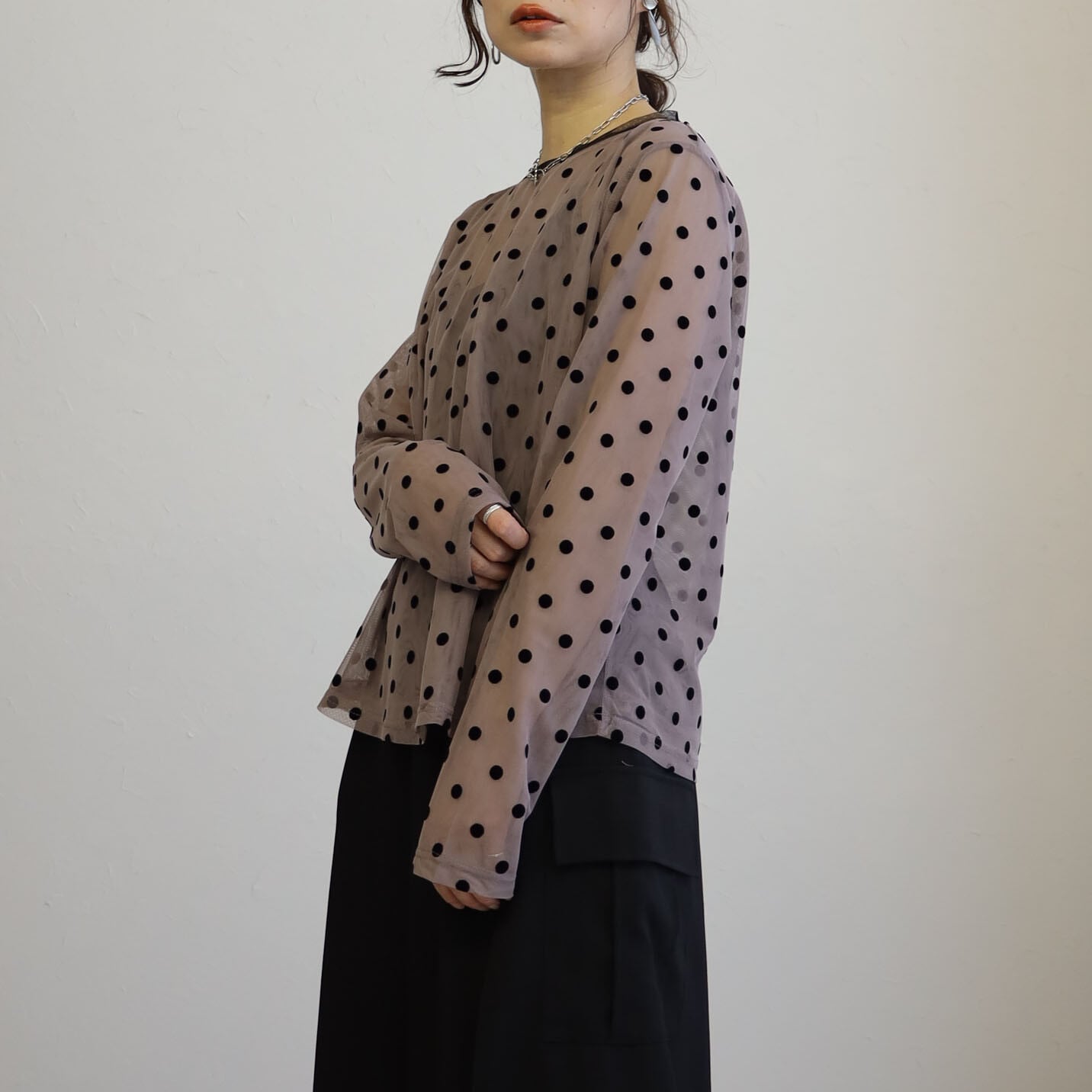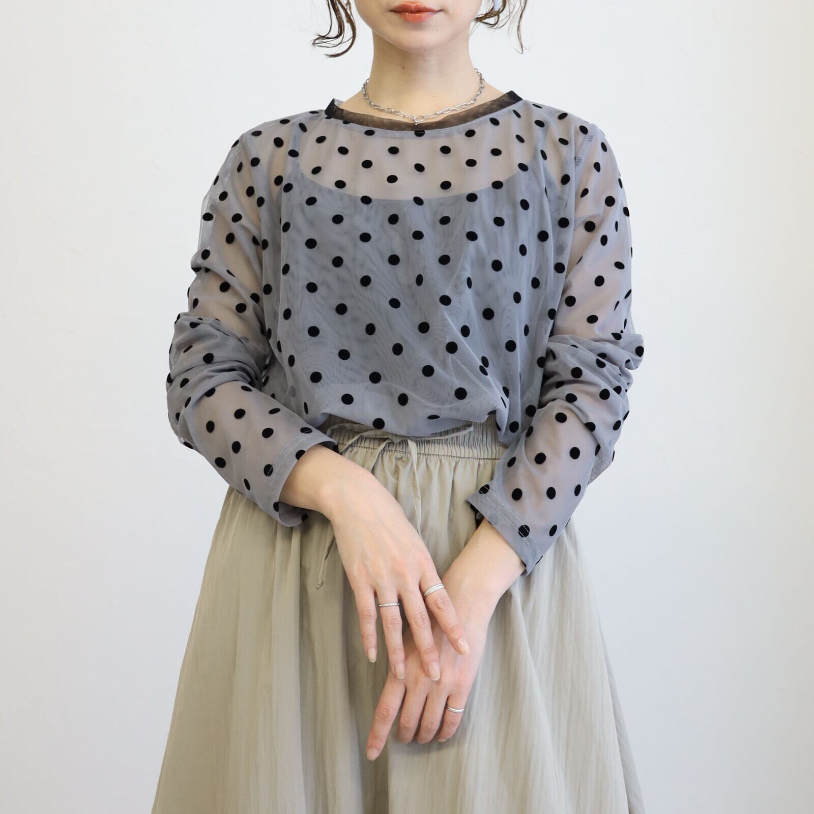 シックな配色×ドットフロッキーが大人フェミニンな仕上がりに品よく透けるシアー素材がレトロになりすぎずモードな雰囲気のアイテムにもまろやかな印象に仕上げてくれますインナーとしてもオススメです生地2重になっております