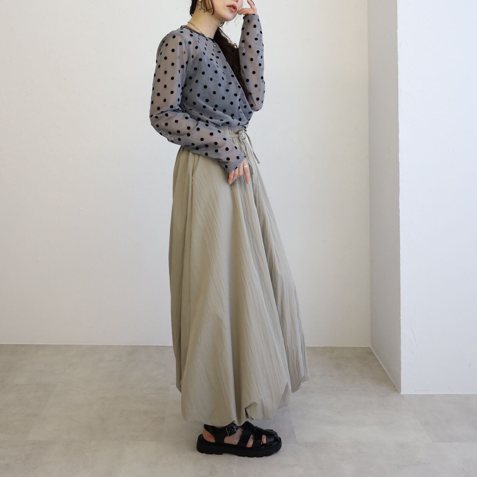 ★シアー素材ドットフロッキー丸首長袖トップス