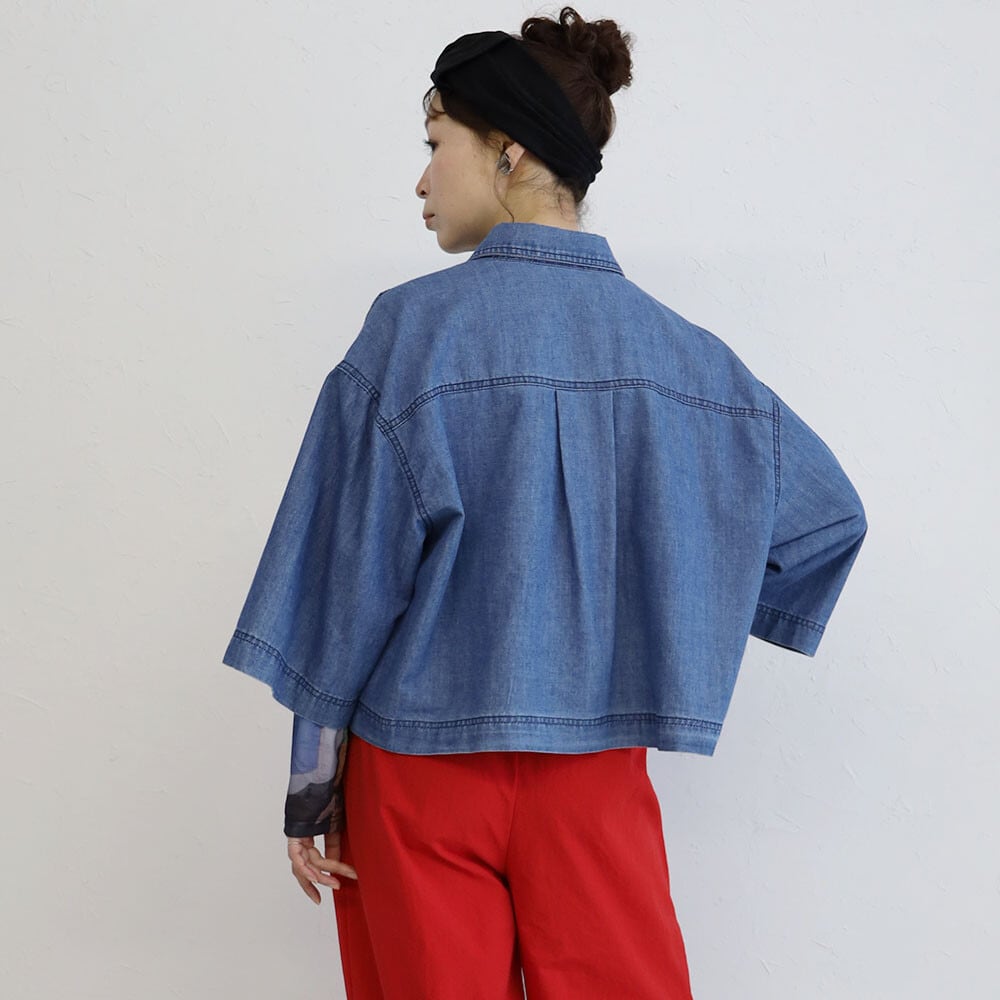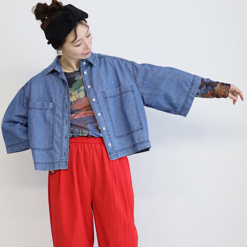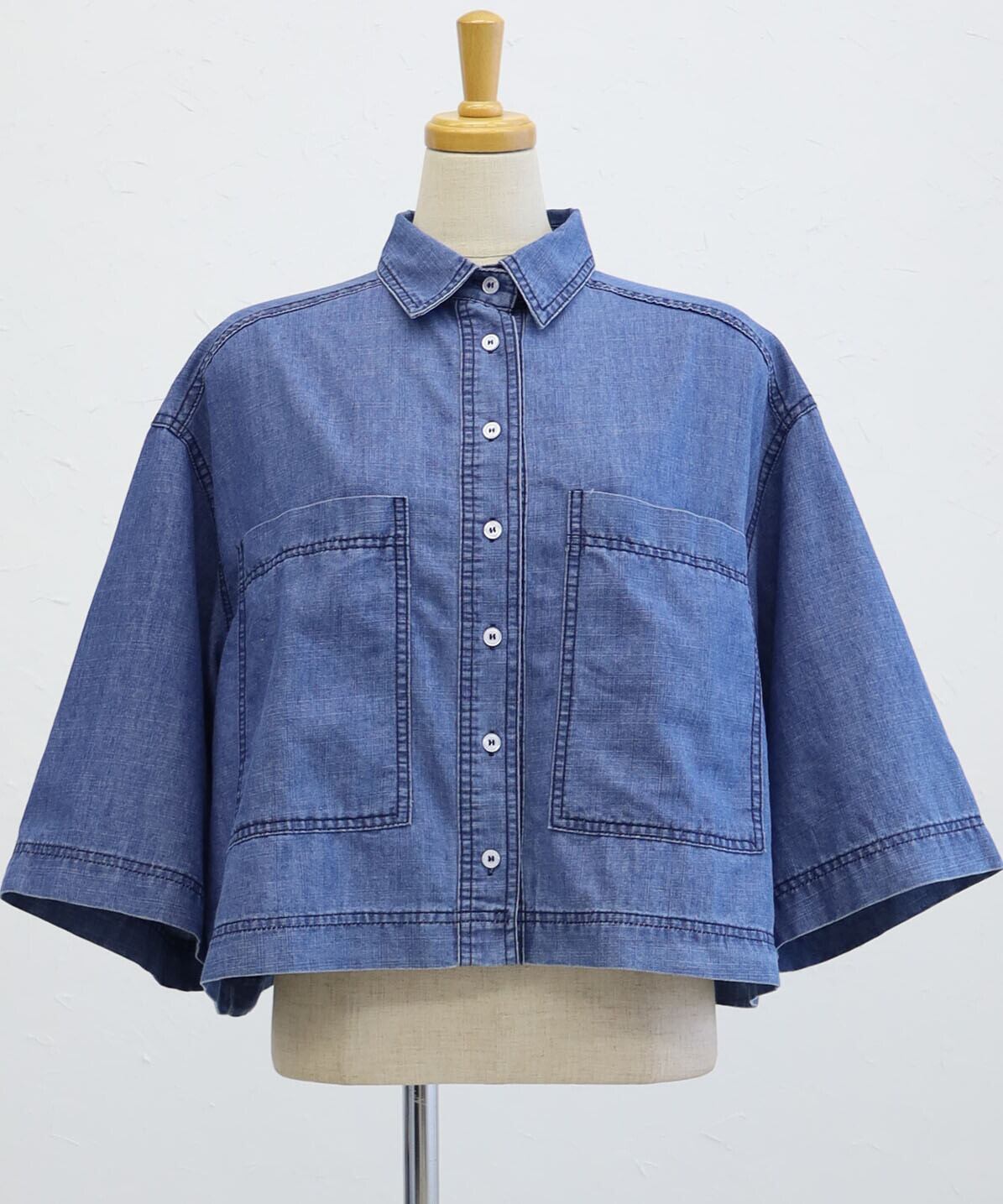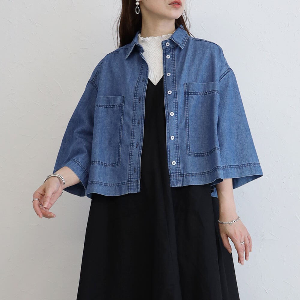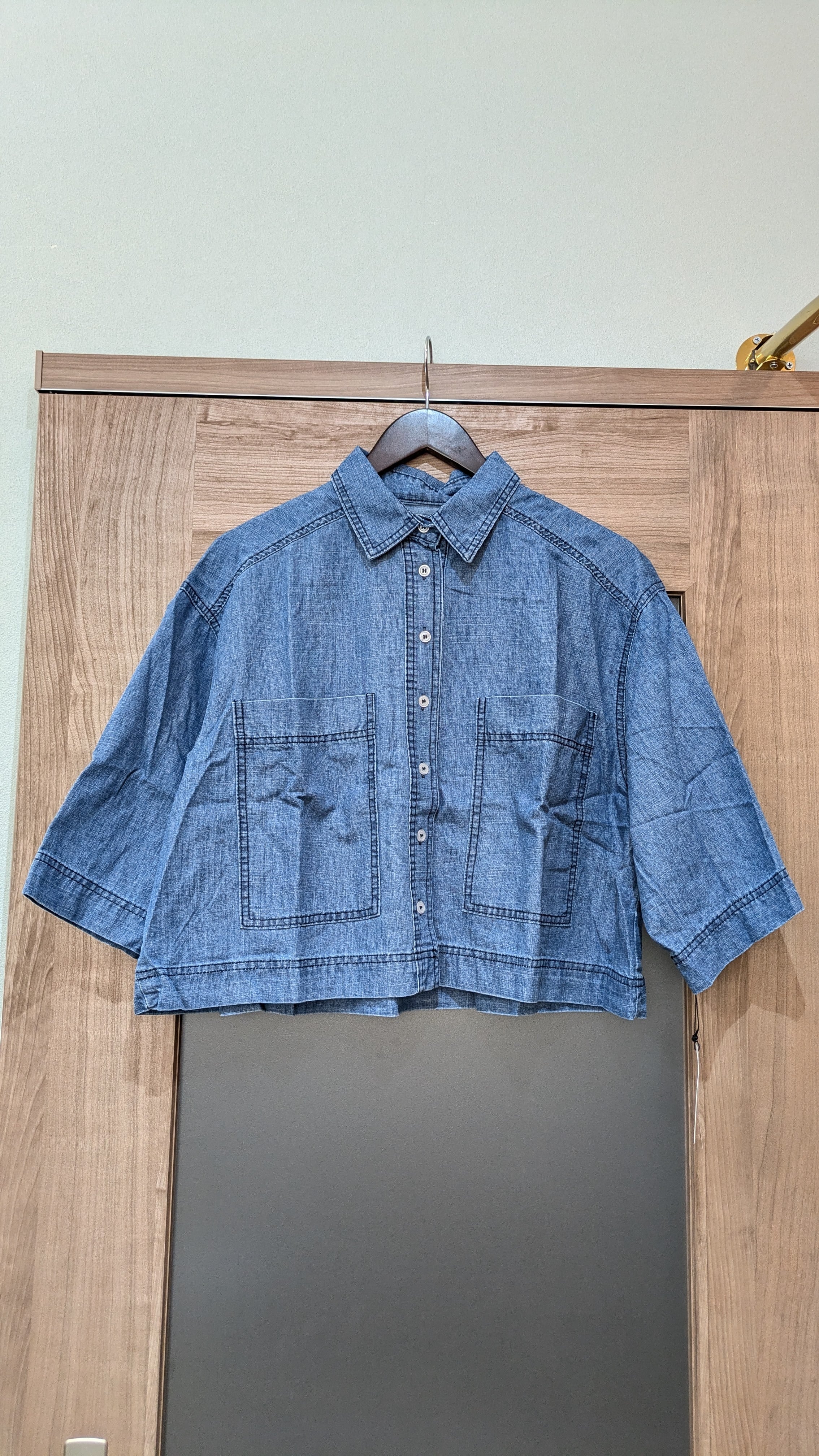 人気のショート丈シャツが人気のデニム素材で登場♪最強の組み合わせ!サラッとした素材で羽織った時から気持ち良さ抜群!絶妙な着丈はオシャレさんには必須アイテム!大きなポッケが可愛い一押しアイテムです