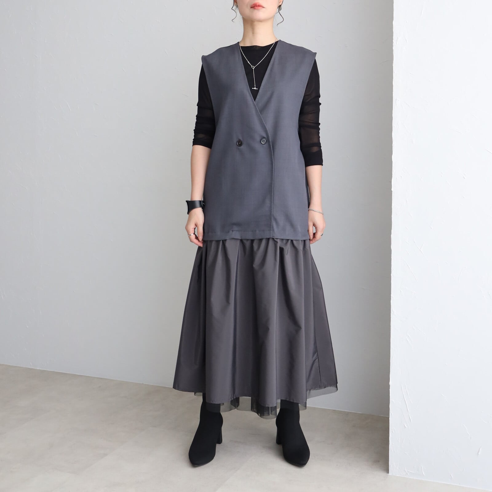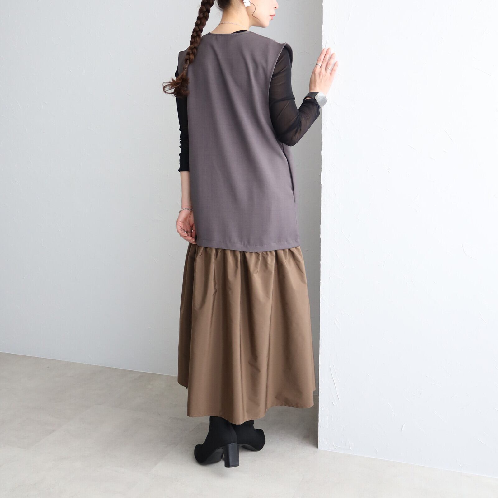 1枚でトレンドスタイリングが完成する異素材ドッキングノースリーブワンピースオーバーサイズのv首ベストにスカートをレイヤードしたようなデザインギャザーから広がるフレアーが女性らしい印象に。