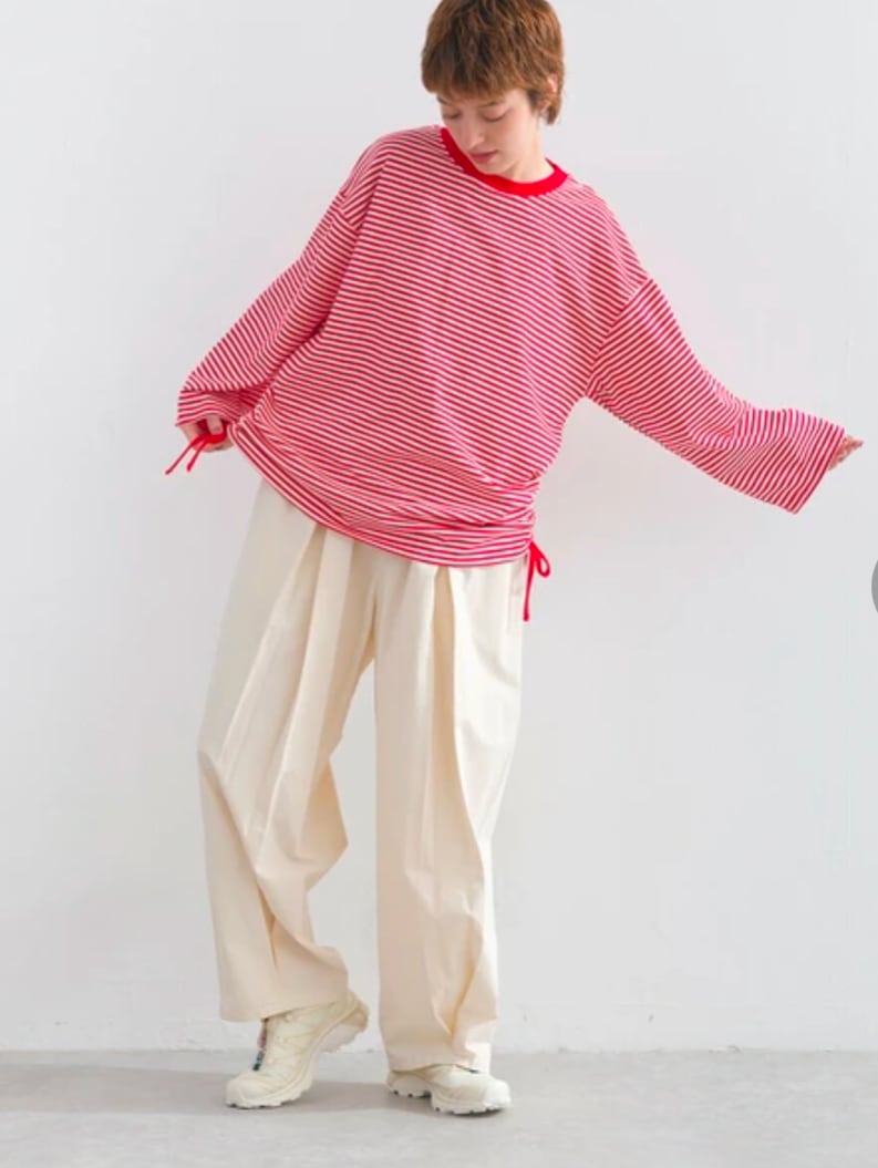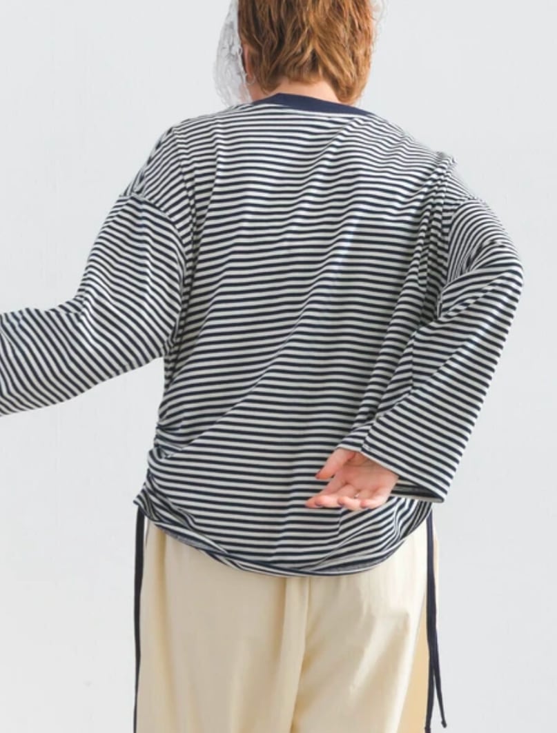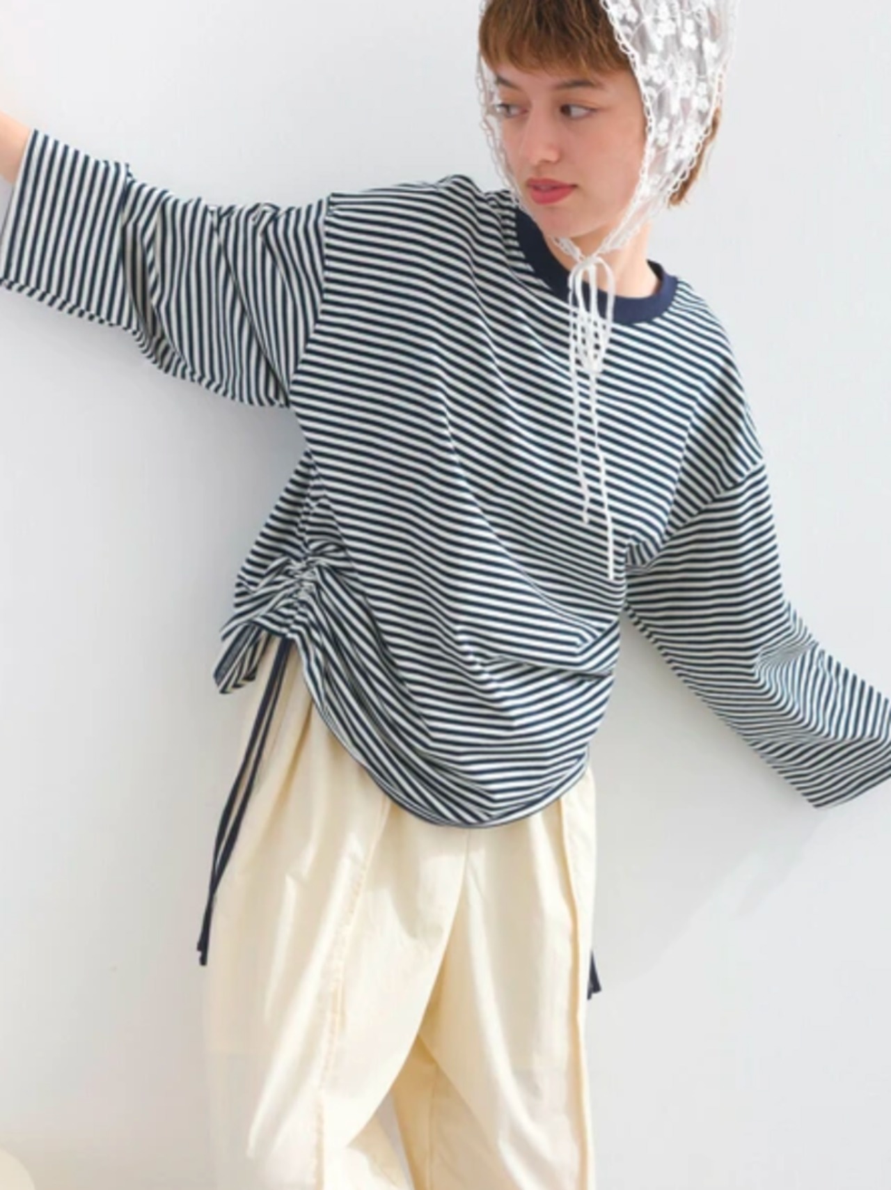 ベーシックなボーダーパターンに、裾のドローストリングを加えたことで、表情豊かなシルエット変化が楽しめるデザイン。