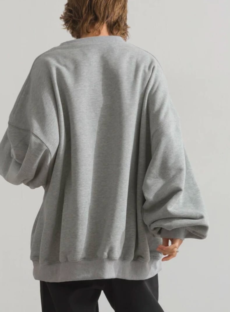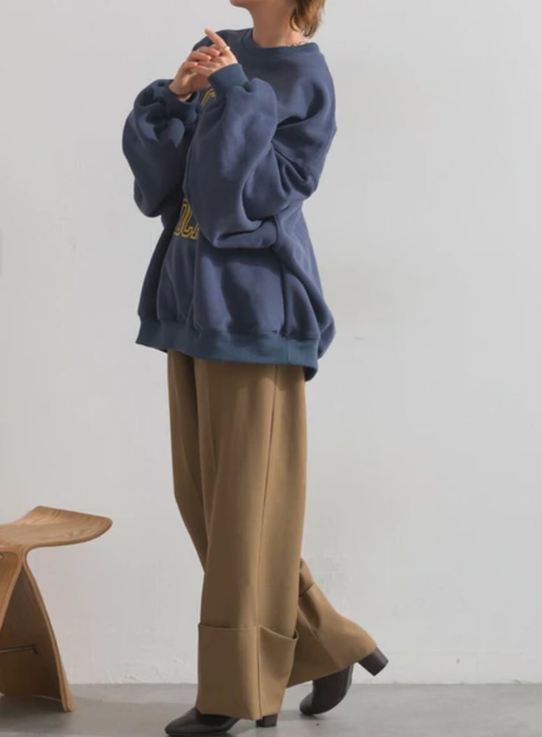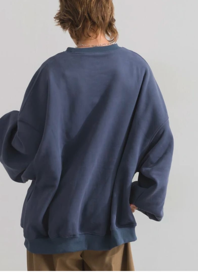 ブラスト加工によるわずかな色落ち効果が、単なるプリント以上の表情を生み出しています。プリントそのものはクラックプリントを採用しており、ひび割れた質感がヴィンテージらしい味わいを演出。プリントのひび割れ具合と生地の表情が融け合うような調和感が、ラフさとこなれ感を両立させています。リブ部分は綿混素材で、ストレッチ性を確保しつつ、編み端の安定感を保つ設計。肩幅や袖幅にゆとりを持たせ、全体のバランスを崩さないように計算されたシルエット設計が、ただの“だぼっと見え”を回避しています。