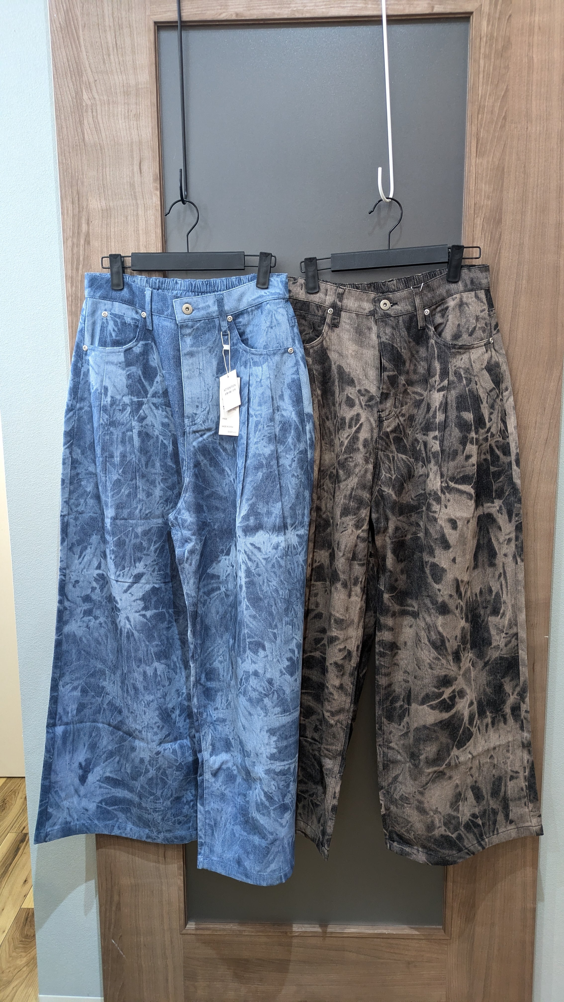 【Design】定番のデニムにタイダイ風のムラ染め加工を施し、一気にトレンド感をアップさせた主役級のワイドパンツ。カジュアルながらも、他にはない個性を演出するデザインです。