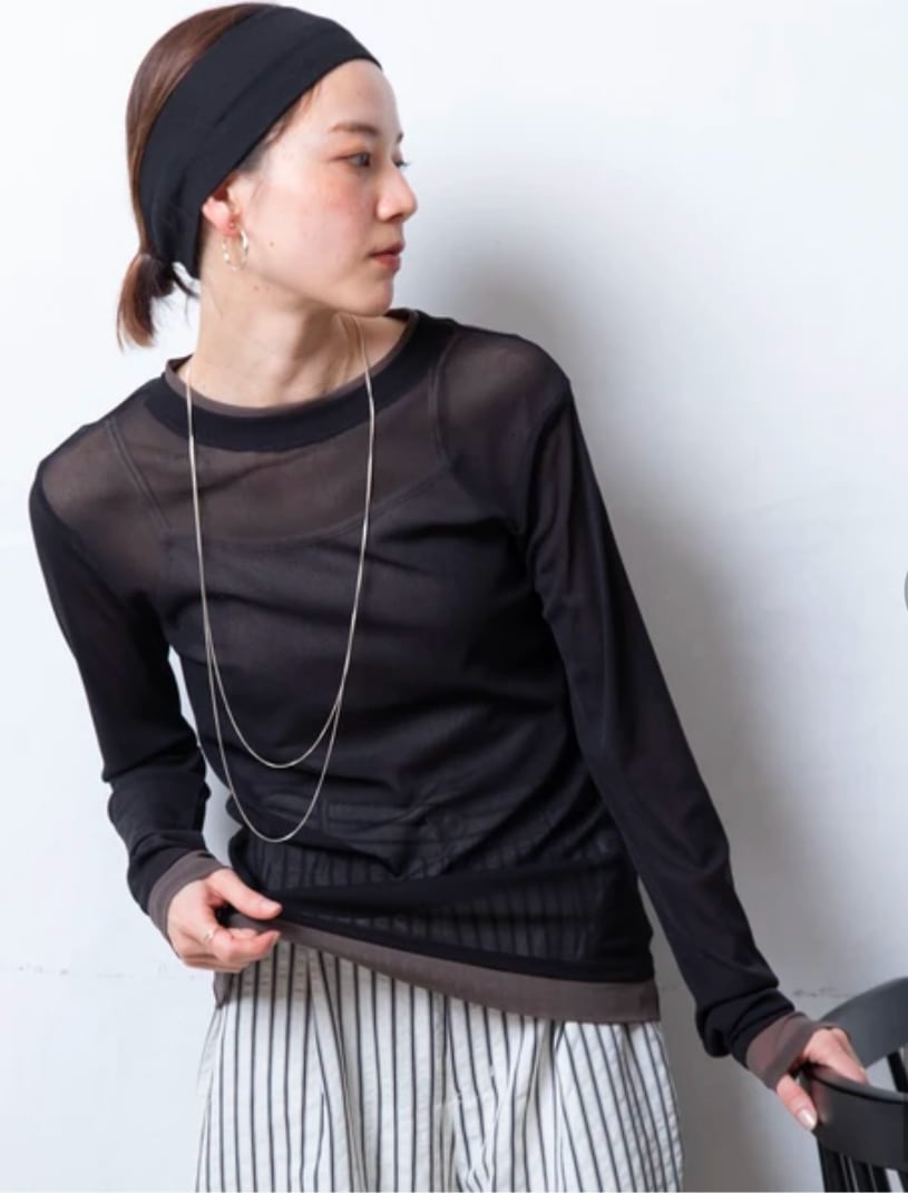 サロペット・ジャンスカ合わせ: 深めのVラインを持つアイテムのインナーとして。シアーな質感が重なりを美しく見せ、軽やかな印象を与えてくれます。