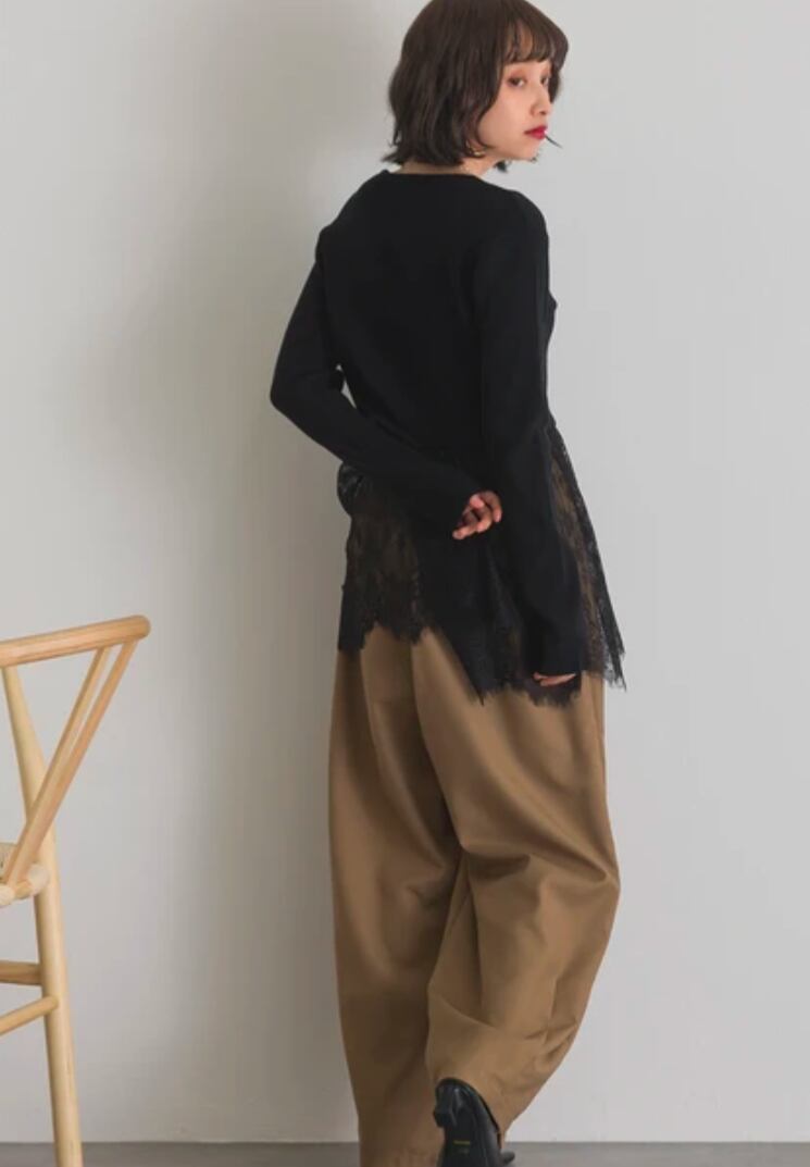 ドッキングされたレースが主役になるため、ボトムはシンプルなパンツやスカートを合わせるだけでバランスよく決まりますワイドパンツやタックパンツと合わせてきれいめに仕上げるほか、ナロースカートやプリーツスカートでフェミニン寄りに仕上げるのもおすすめレースの縦ラインがスタイルアップして見えるため、アウターを羽織っても存在感をキープできますアイボリーは柔らかく優しい雰囲気に、ブラックはレースの美しさがより映える大人な印象にまとまります