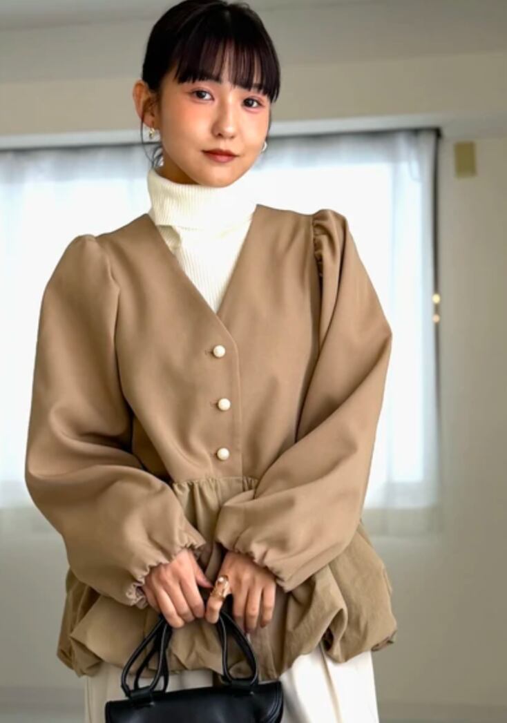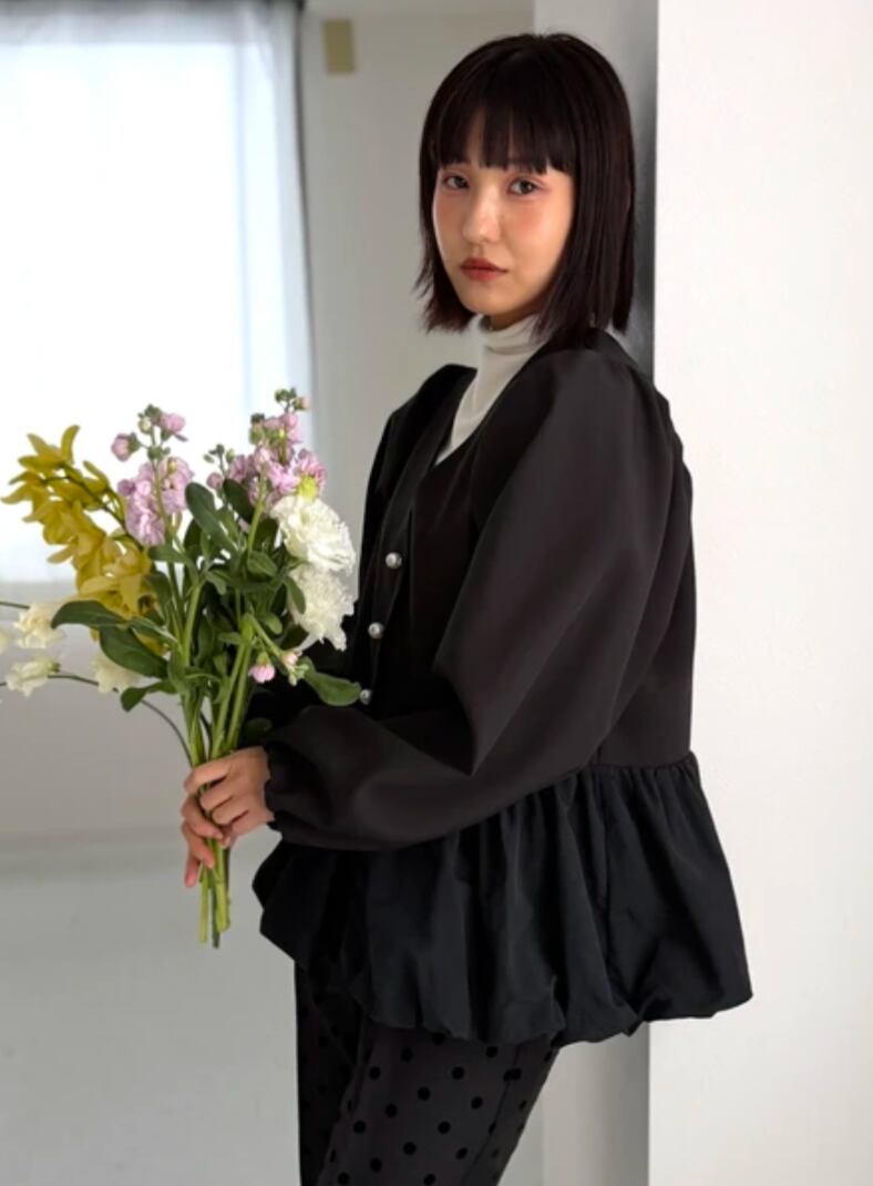 ジャケット レディース アウター バルーン裾 Vネックジャケット 軽量 パール風ボタン ドット柄 26028