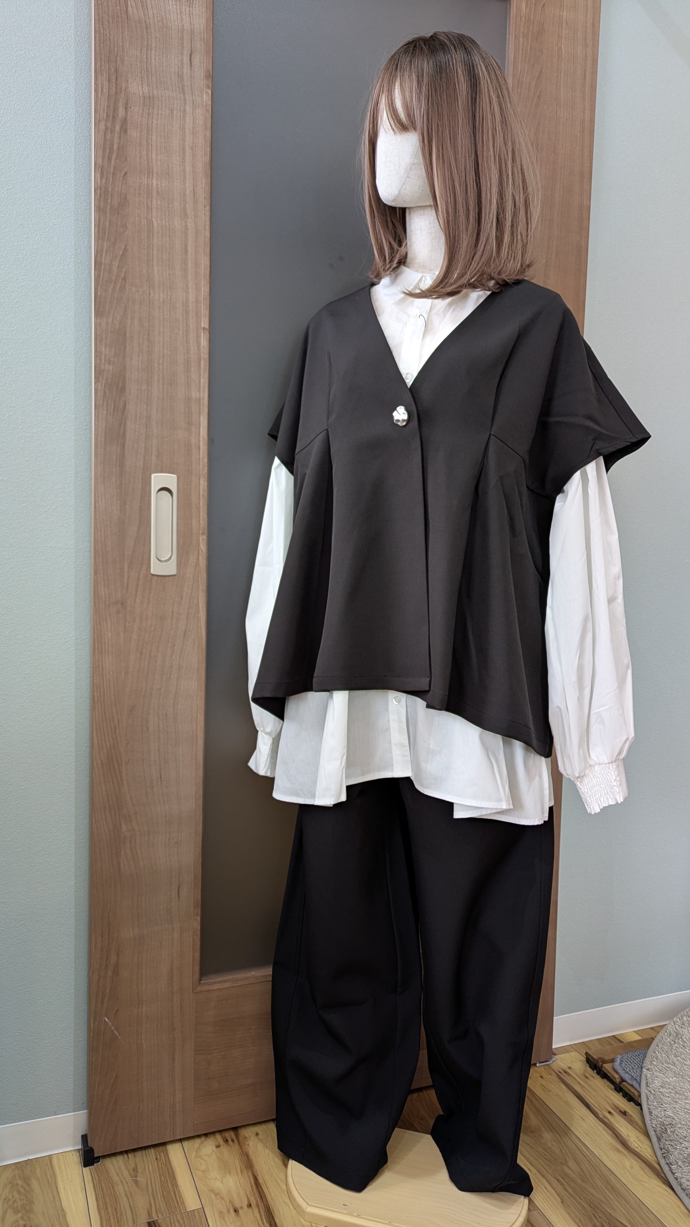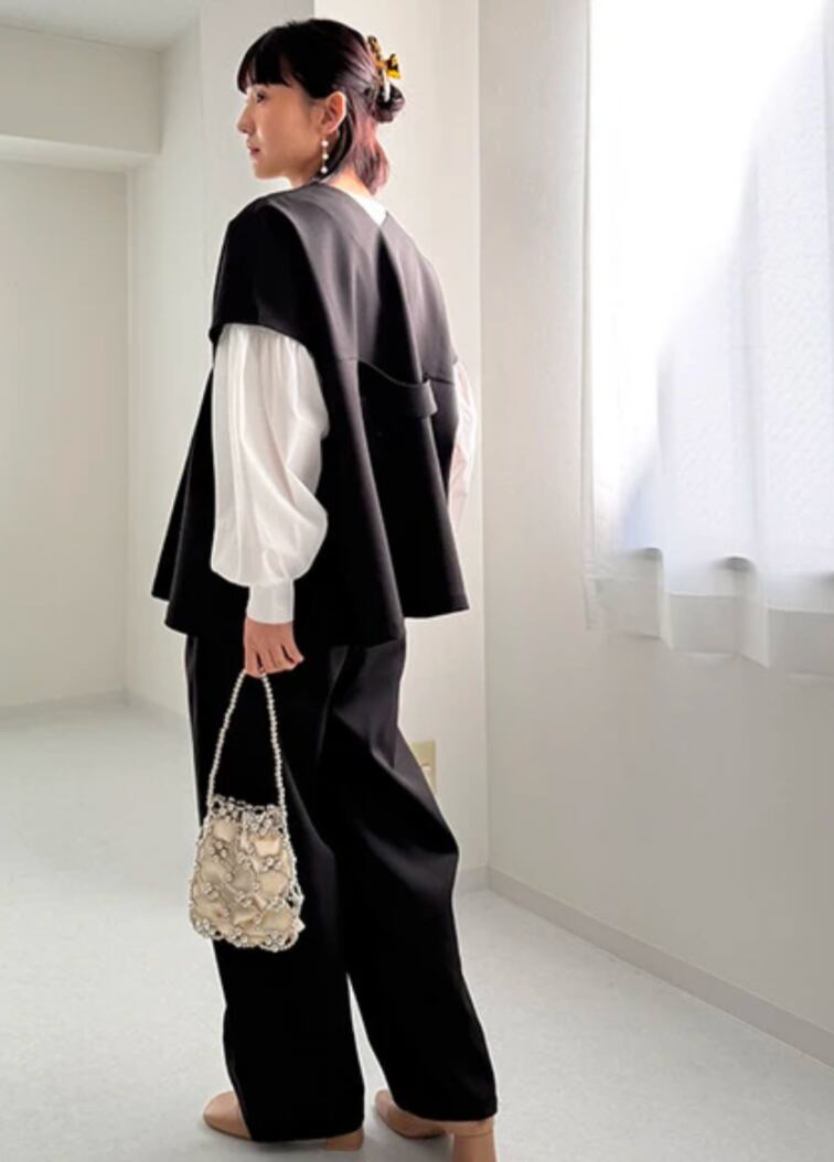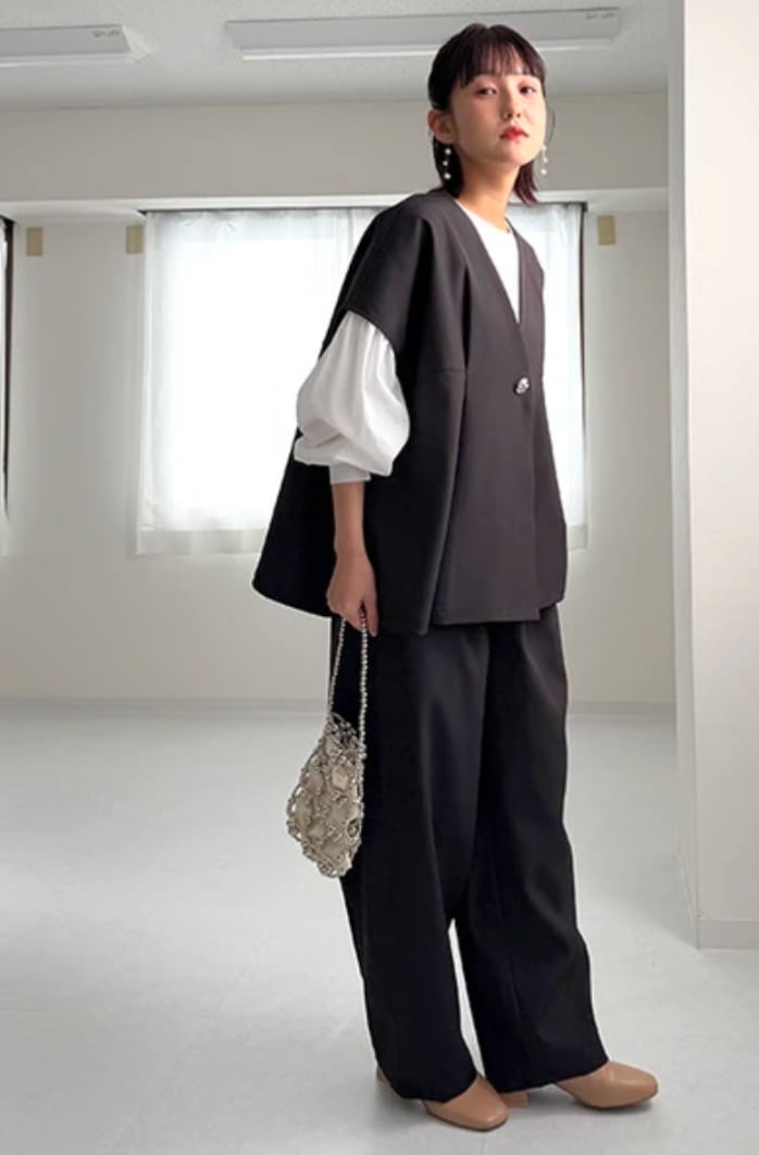 ゆったりしているのでFサイズと記載していますが体型問わずお召いただけるアイテムです。全面にタックが入っておりラクに着こなしつつスッキリとした印象にしてくれます。