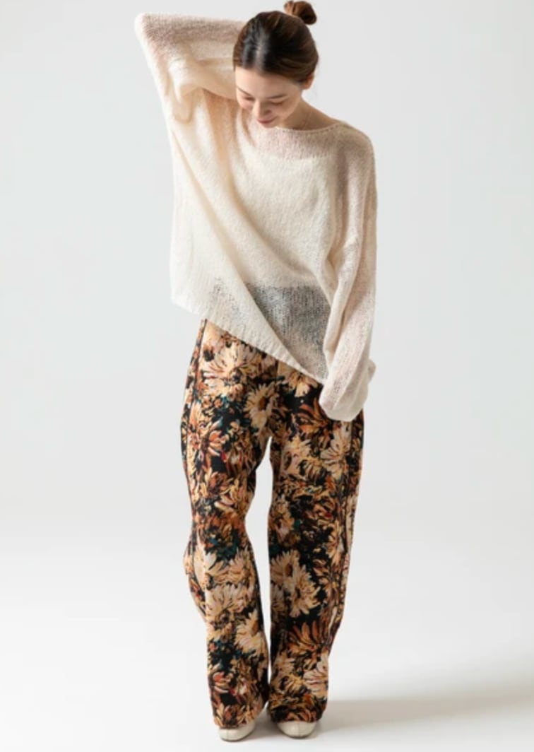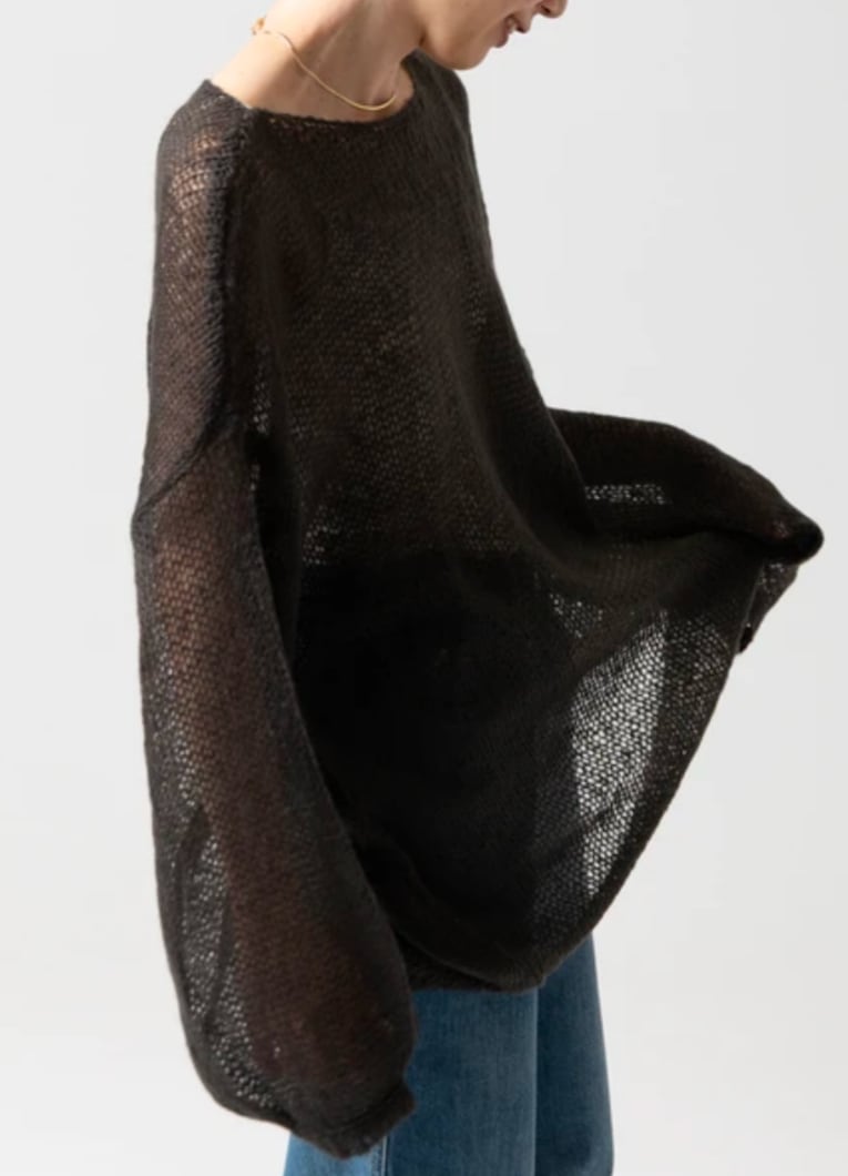 【Design】ざっくりと編まれたローゲージのニットに、透け感をプラスした軽やかなプルオーバー。重くなりがちなローゲージニットも、シアー素材にすることで、女性らしく抜け感のある印象に仕上がります。ゆったりとしたシルエットと、ドロップショルダーがリラックス感のある着心地を叶えます。一枚で主役になるアイテムですが、様々なインナーとのレイヤードも楽しめる万能なデザインです。