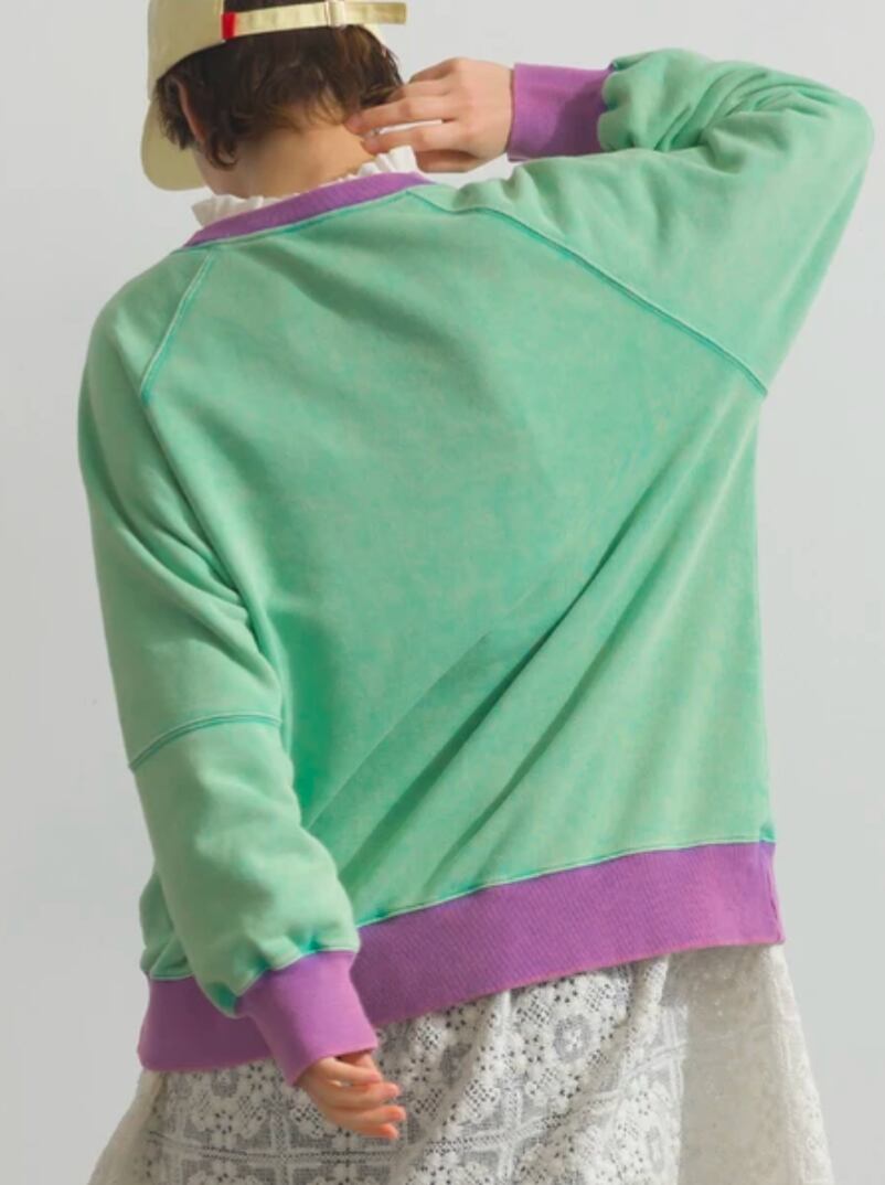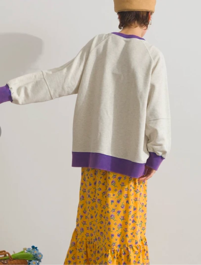 フロントに大胆に配置されたフラワー転写プリントと、タイポグラフィの組み合わせが目を惹くキャッチーなデザインです。カラフルでありながらも、製品加工を重ねることで色が強くなりすぎず、大人の日常に溶け込む絶妙なトーンに落とし込みました。首元や袖口、裾にあしらったバイカラーのリブが、ポップなアクセントとして全体を引き締め、ブランドらしい自由な遊び心を表現しています。ラグランスリーブの切り替えや、ゆとりを持たせたサイジングによって生まれる丸みのあるフォルムが、マニッシュな裏毛素材に柔らかな女性らしさをプラス。細部に至るまで計算されたリメイク風のディティールが、単なるスウェットに留まらない、洗練された個性を演出する一着です。