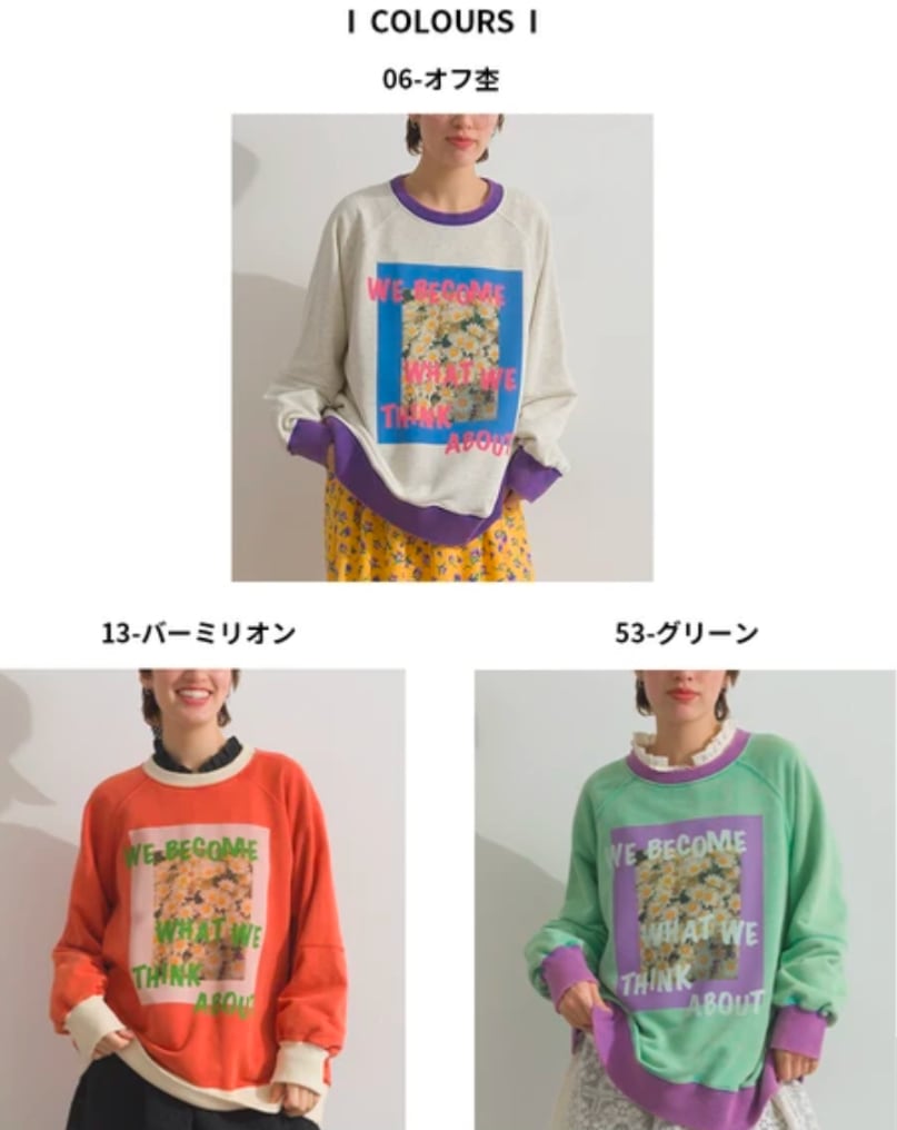 裏毛 スウェット ユーズド加工 バイカラー フラワー 転写 プリントプルオーバー 長袖【2026春夏新作】