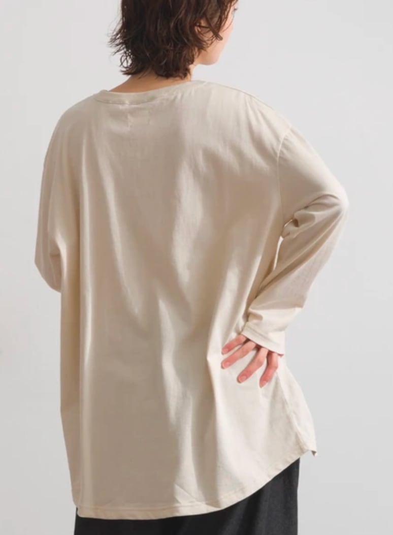 特筆すべきは、異素材を組み合わせた「透かしパッチワーク」の精巧さ。単なる切り替えではなく、ベースとなる20s天竺のタフな質感と、布帛部分の繊細な表情が対比されることで、圧倒的な上質さと奥行きを演出します。密度の高い本体生地は透けにくさに優れ、パッチワーク部分とのコントラストを際立たせつつも、一枚着としての安心感を決して損ないません。