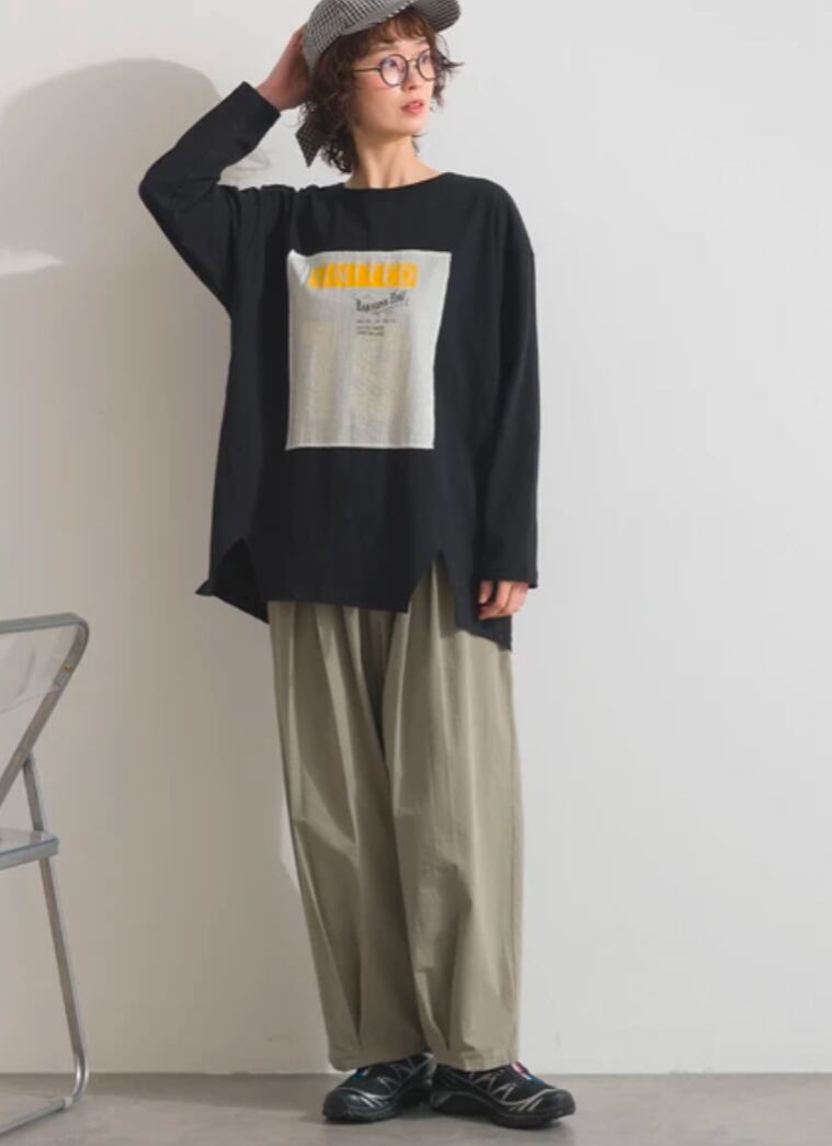 パッチワークのデザイン性を主役にするため、ボトムスはシンプルなワイドチノや、素材感のあるコーデュロイパンツを合わせるのがおすすめです。生地に確かな厚みがあるため、一枚で着用しても物足りなさがなく、洗練されたカジュアルスタイルが完成します。また、インナーとして着用した際も、首元のロゴやパッチワークの質感が覗くことで、コーディネートに深みを与えてくれます。高見えする異素材のコンビネーションが、いつもの日常着を一段上のスタイルへと引き上げてくれます。
