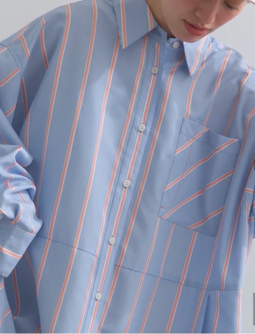 素材は、カラーによって異なるこだわりを詰め込みました。無地の「ブロッサム」と「ボトルグリーン」には、細番手のポリエステル糸を高密度に織り上げたとろみのあるシャツ地を採用。シワになりにくく、さらりとした質感で、お手入れのしやすさと上品な落ち感を両立しています。一方、爽やかな「ストライプ」は、オレンジの差し色が効いたドビーストライプ生地。綿混ならではの程よいハリ感と通気性の良さが魅力で、どちらの素材も軽やかで、SSシーズンを快適に過ごせる万能な仕上がりです。