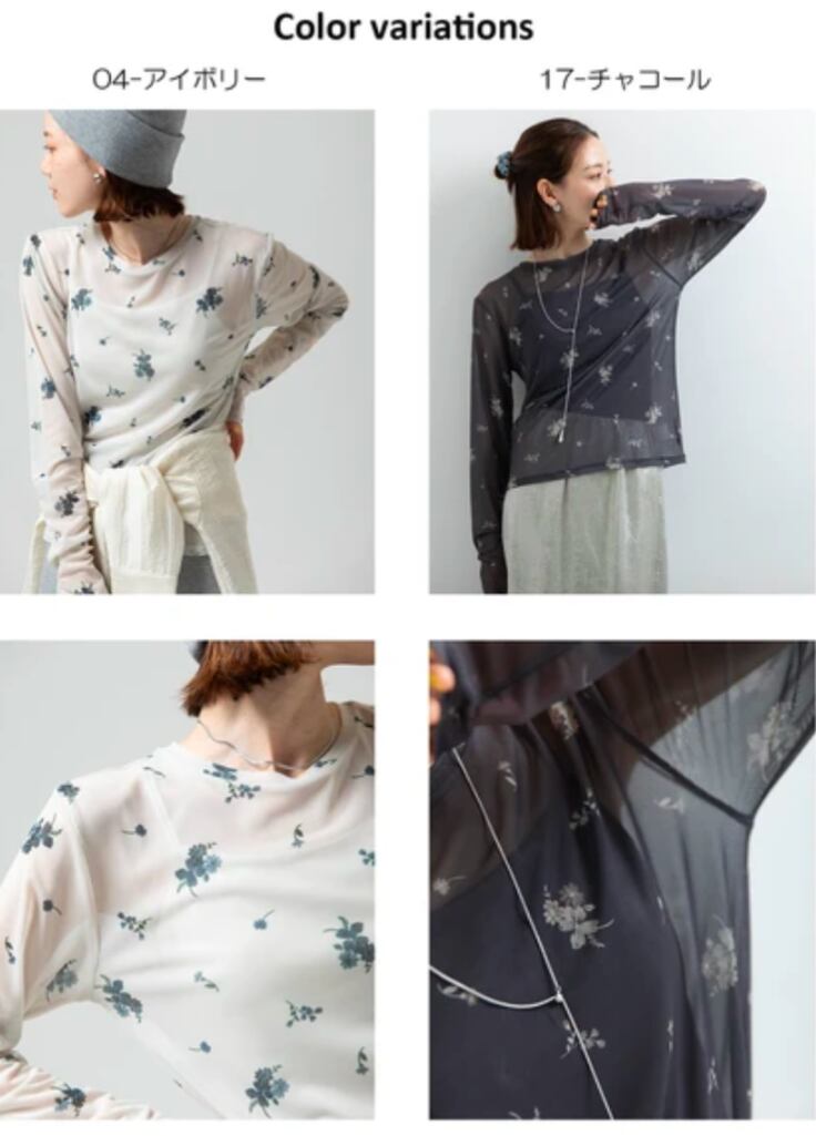 透け感と小花柄: 薄手で透け感のあるシアー素材に、主張しすぎない可憐な小花柄を全面にプリント。上品な肌見せと、さりげない柄使いで、コーディネートにフェミニンな要素をプラスします。