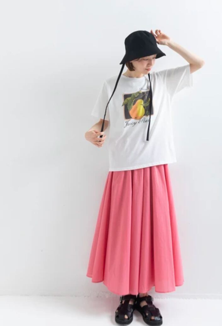【Styling】大人のカジュアルスタイル: ロゴTシャツやスニーカーで外して、ラフなデイリースタイルに。スカートのボリューム感が、カジュアルな装いをクラスアップしてくれます。