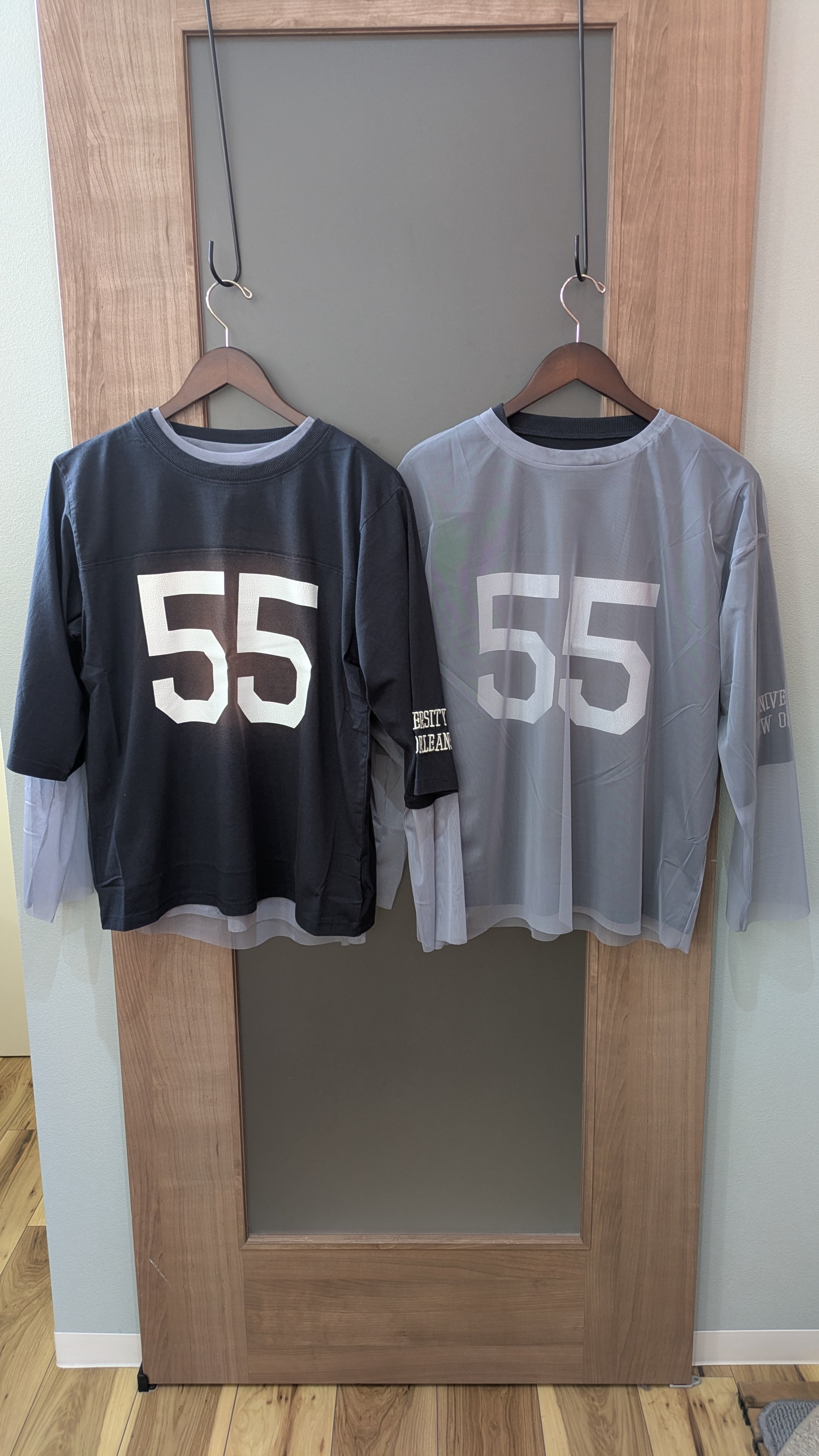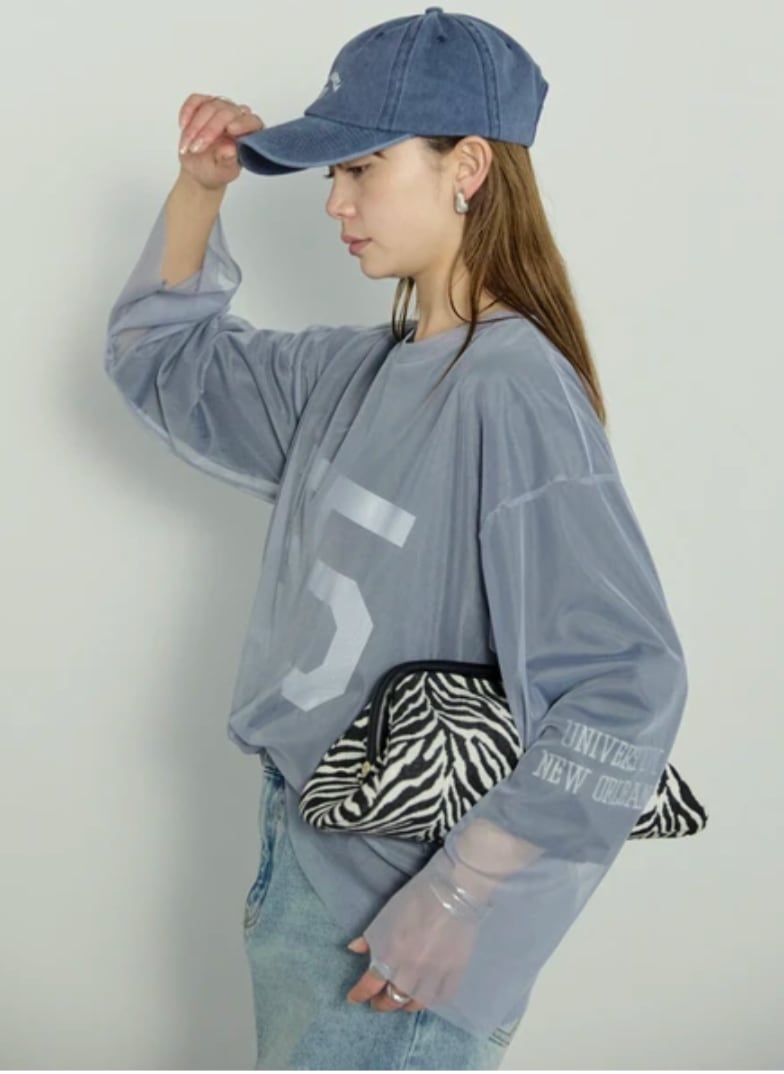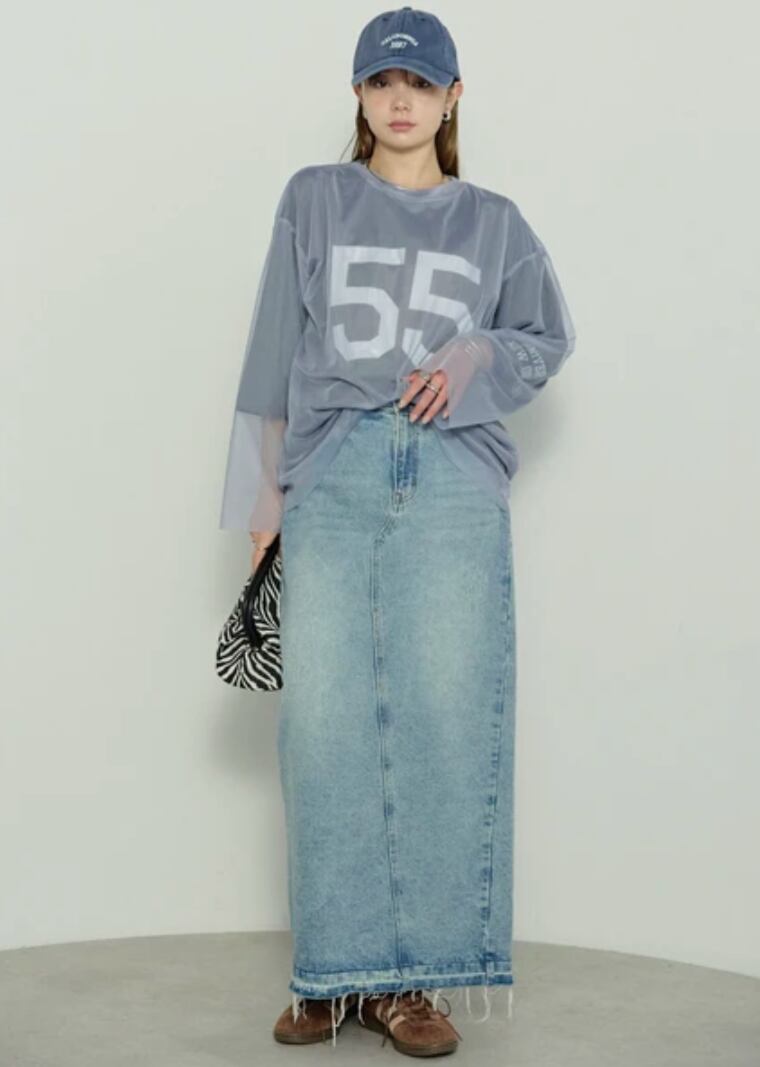 フロントに大胆に施された「55」のナンバリングプリントが目を引く、チュールトップスとTシャツのセットアイテムです。最大のこだわりは、その圧倒的な着回し力。内衣のTシャツは、1枚でも主役を張れるクリーンなデザインに仕上げ、外衣のチュールはレイヤードの核として計算された絶妙なサイジングに。チュールを上に重ねれば、プリントがヴェールの向こうに透けて見えるニュアンス豊かなストリートスタイルに。逆にチュールをインナーとして忍ばせ、袖口や裾からシアー感を覗かせれば、奥行きのある洗練されたフォルムへと変化します。