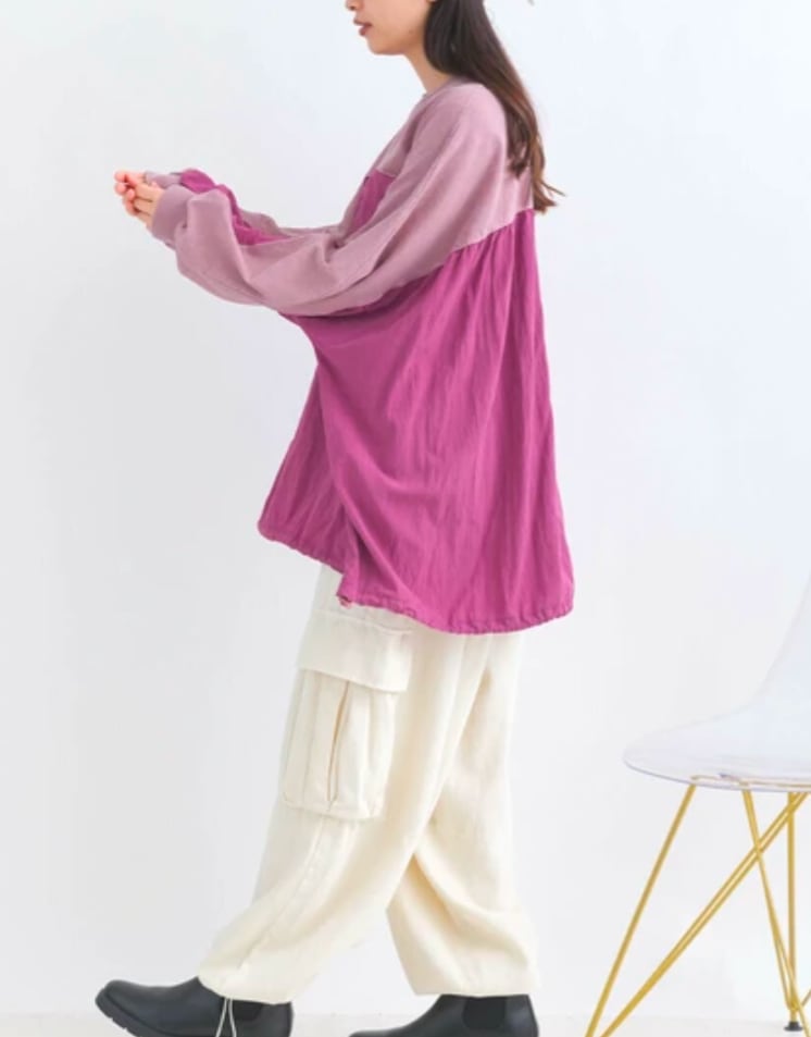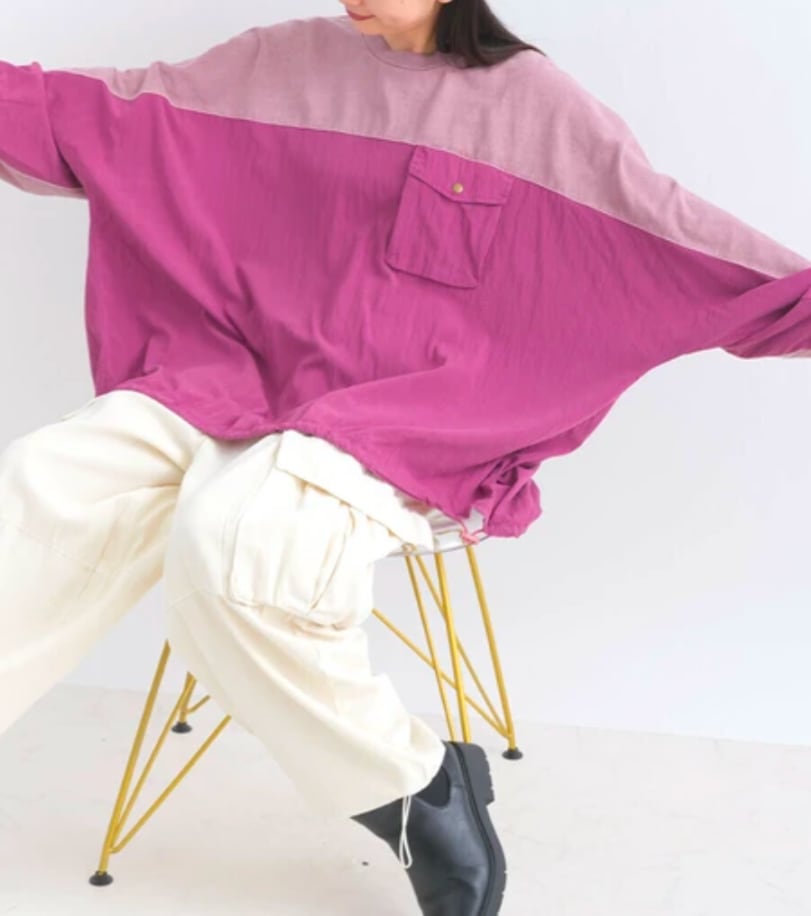 このドルマンプルオーバーは、ゆったりとしたシルエットと異素材の組み合わせが魅力の一着です。ピグメント加工による風合い豊かなコットン素材と、軽やかで柔らかな別布のコントラストが、洗練された大人のカジュアルスタイルを演出します。